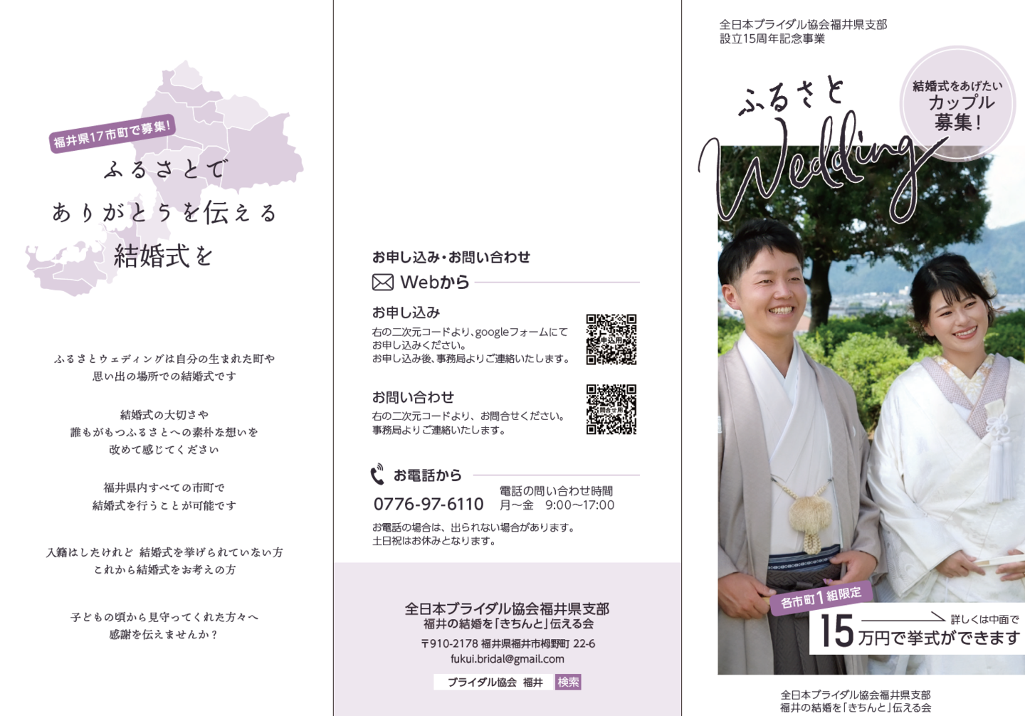 全日本ブライダル協会福井県支部では、15周年から20周年を記念いたしまして、福井県内17市町1組限定での結婚式を実施しております。